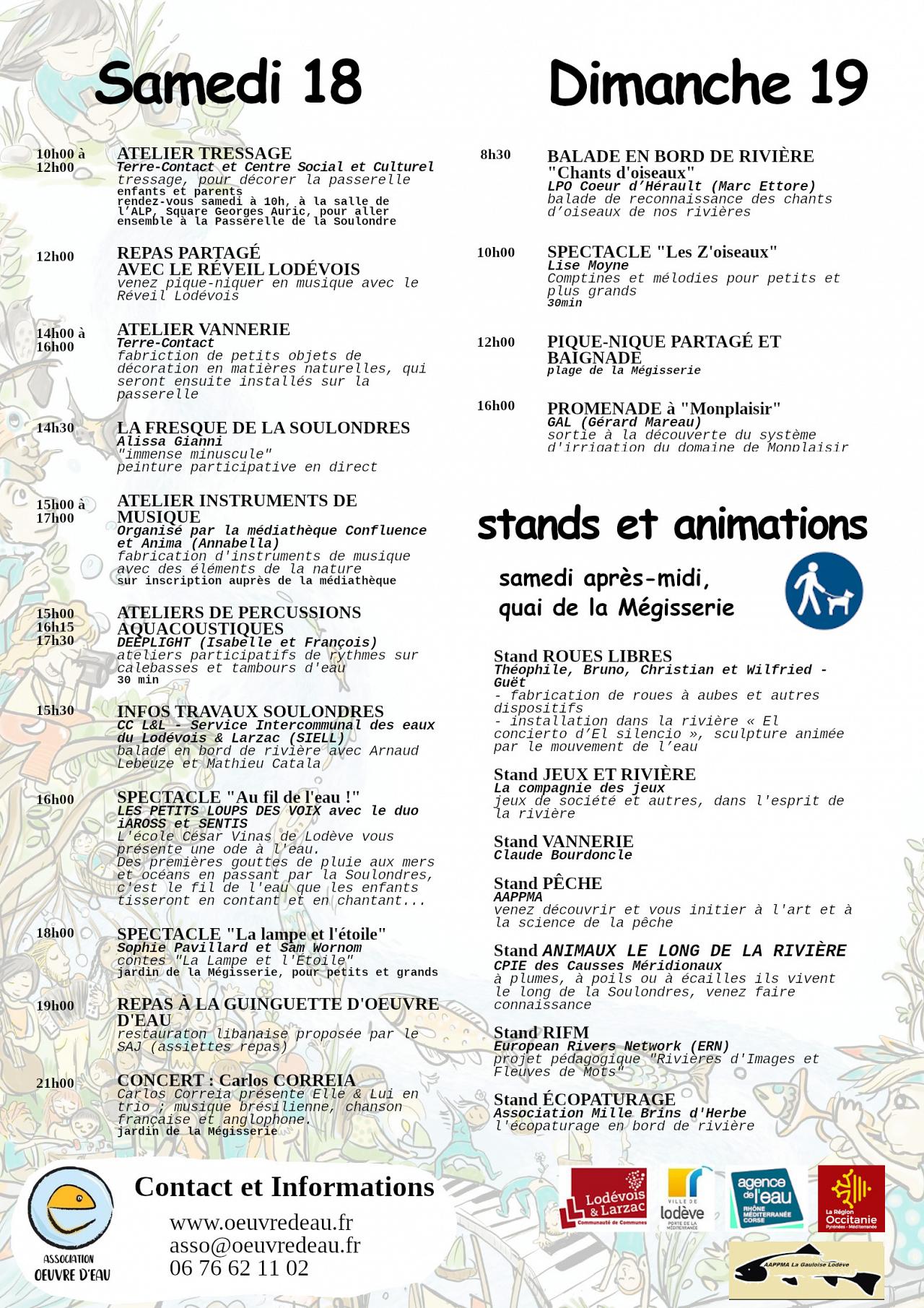 Rivières en Fête 2022 Accueil > Rivières en fête > Rivières en Fête 2022 Animations, Spectacles, Balades, Concerts, Guinguette... pour petits et grands (évènement gratuit) Les samedi 18 et dimanche 19 juin 2022, sur les berges de la rivière Soulondres Quai de la Mégisserie à Lodève Portfolio